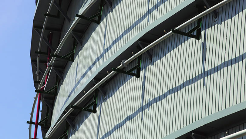 寶鋼彩涂用于中石油儲油罐圍護(hù),采用高耐候鍍鋁鋅彩涂鋼板,顏色為本灰,牌號為TS300GD+AZ,鋁鋅層重量150克/平方米。