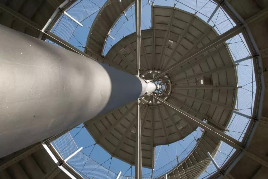 兩條反向螺旋樓梯像極了飄逸的絲帶,從不同的位置開(kāi)始上升環(huán)繞,在15.3m高的屋頂平臺(tái)連成一體。